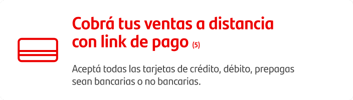 ![]() | Cobrá tus ventas a distancia con link de pago(6) Aceptá todas las tarjetas de crédito, débito, prepagas sean bancarias o no bancarias. |